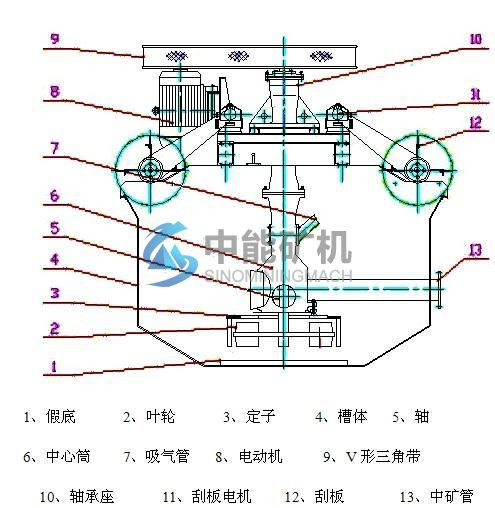 The motor drives the main shaft through the V-belt to rotate the lower impeller. The air is sucked into the upper impeller cavity through the suction pipe and the central cylinder, and is mixed with the sucked slurry to form mineralized bubbles, which separates useful minerals and obtains the required of minerals.